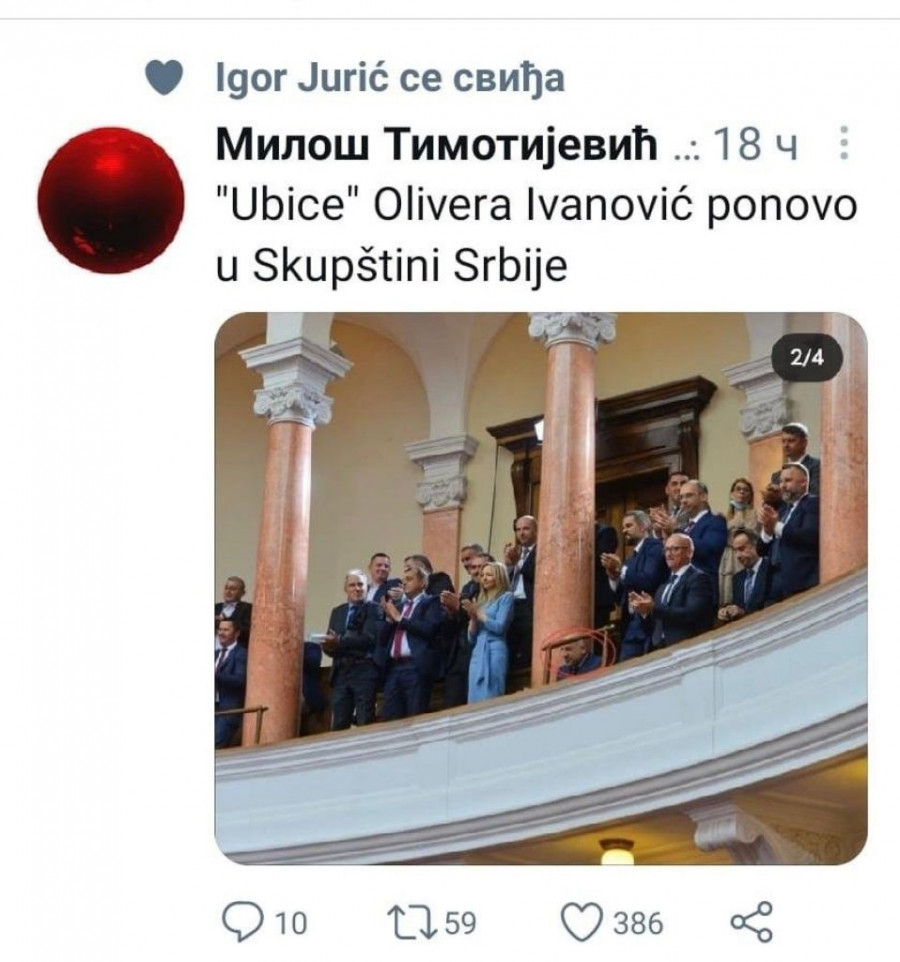 - "Ubice" Olivera Ivanovića ponovo u Skupštini Srbije - stajalo je u originalnom postu koji je Jurić lajkovao, čime je i više nego jasno izrazio svoj politički stav.
