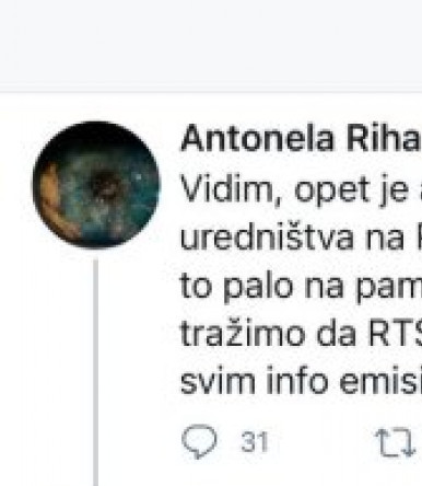 - Vidim, opet je aktuelizovana ideja o dva uredništva na RTS. Ne znam kome je i kako to palo na pamet, možda je ipak bolje da svi tražimo da RTS izveštava profesionalno u svim info emisijama - napisala je Riha, na šta joj je novinarka Gojgić odgovorila: