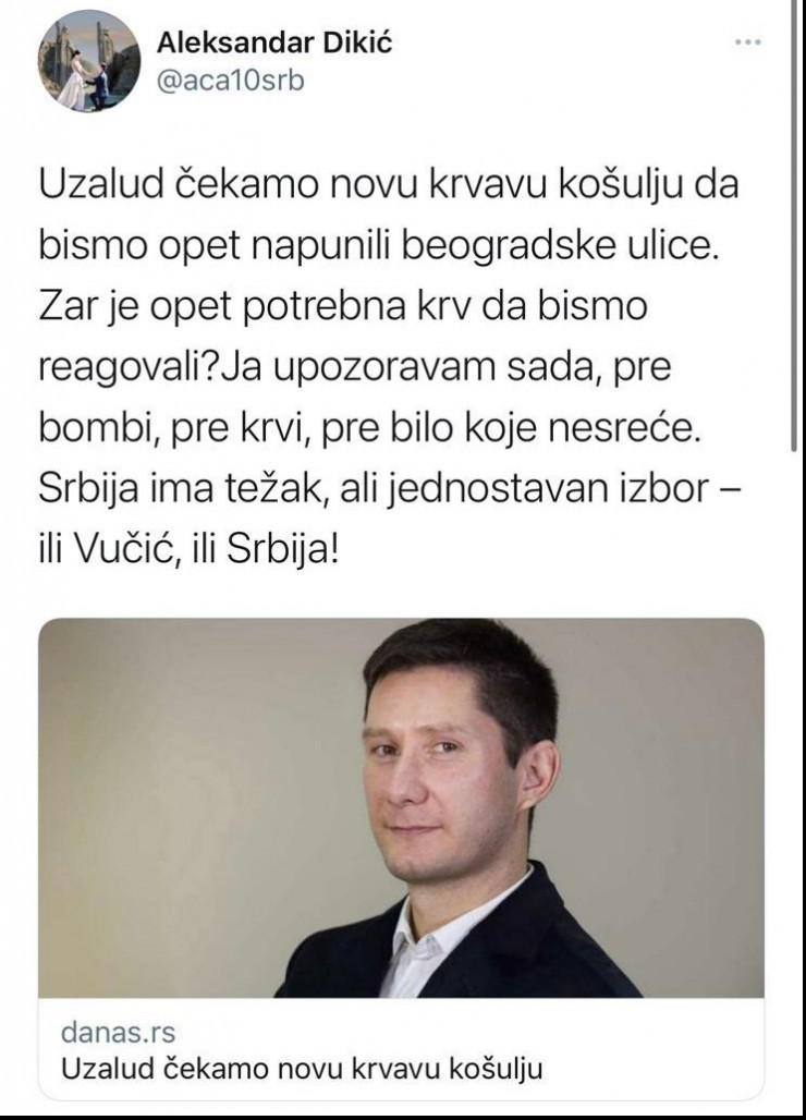 - Uzalud čekamo novu krvavu košulju da bismo opet napunili beogradske ulice. Zar je opet potrebna krv da bismo reagovali? Ja upozoravam sada, pre bombi, pre krvi, pre bilo koje nesreće. Srbija ima težak, ali jednostavan izbor - ili Vučić, ili Srbija! - napisao je Dikić.
