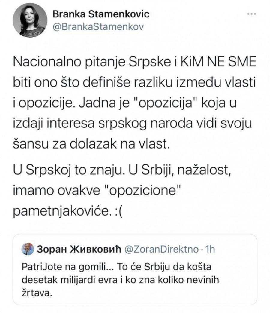 - Nacionalno pitanje Srpske i KiM ne sme biti ono što definiše razliku između vlasti i opozicije. Jadna je "opozicija" koja u izdaji srpskog naroda vidi svoju šansu za dolazak na vlast. U Srpskoj to znaju. U Srbiji, nažalost, imamo ovakve "opozicione" pametnjakoviće - prokomentarisala je Stamenković objavu Zorana Živkovića.