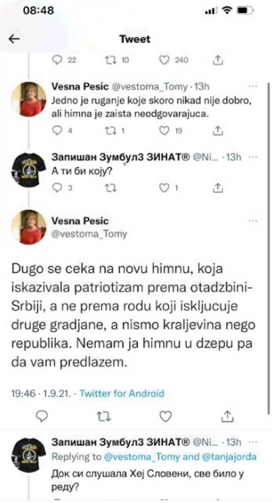 Tako se Đilasov kolumnista Teofil Pančić pita koja to stoka pase u srpskoj himni, a Vesni Pešić koja podrzava Mariniku Tepic smetaju Srbi u himni!