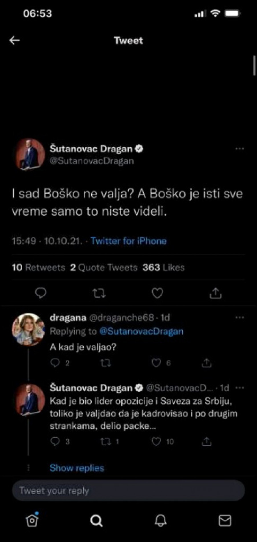 "I sad Boško ne valja? A Boško je isti sve vreme samo vi to niste videli -napisao je Šutanovac na Tviteru.
