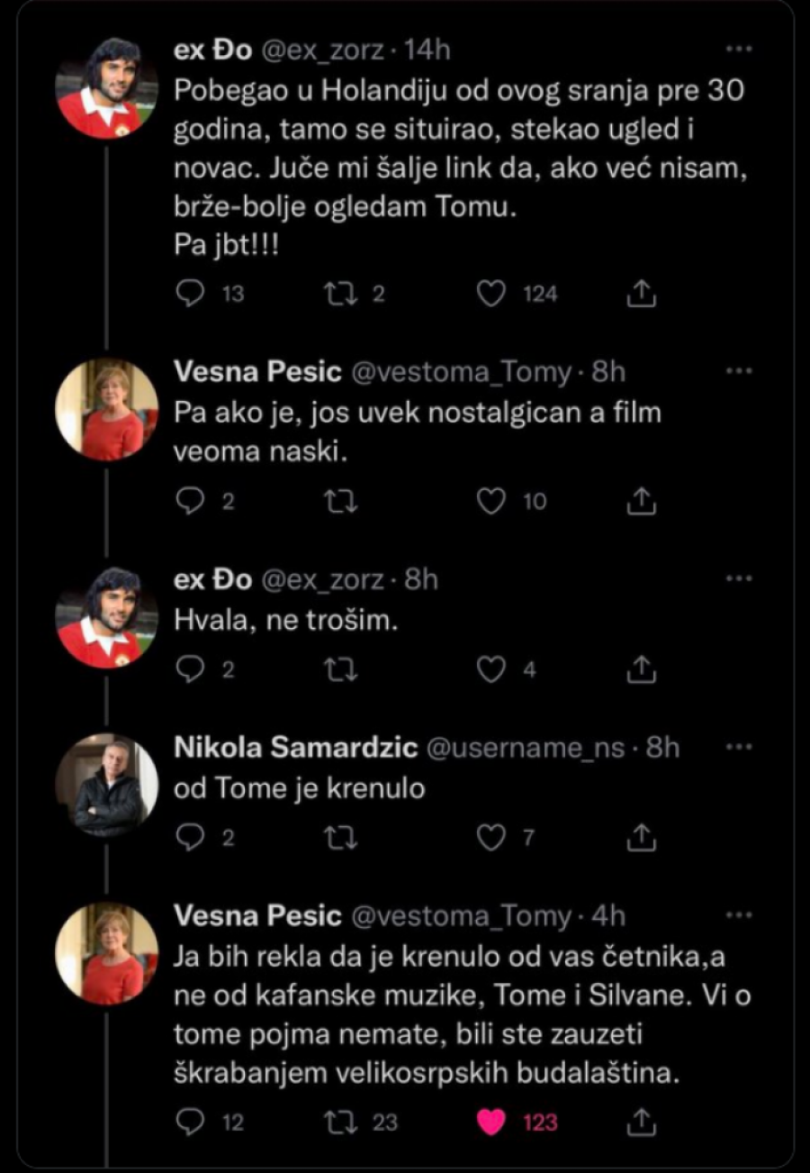 - Ja bih rekla da je krenulo od vas četnika, a ne od kafanske muzike, Tome i Silvane. Vi o tome pojma nemate, bili ste zauzeti pisanjem velikosrpskih budalaština - zaključila je Pešićeva.