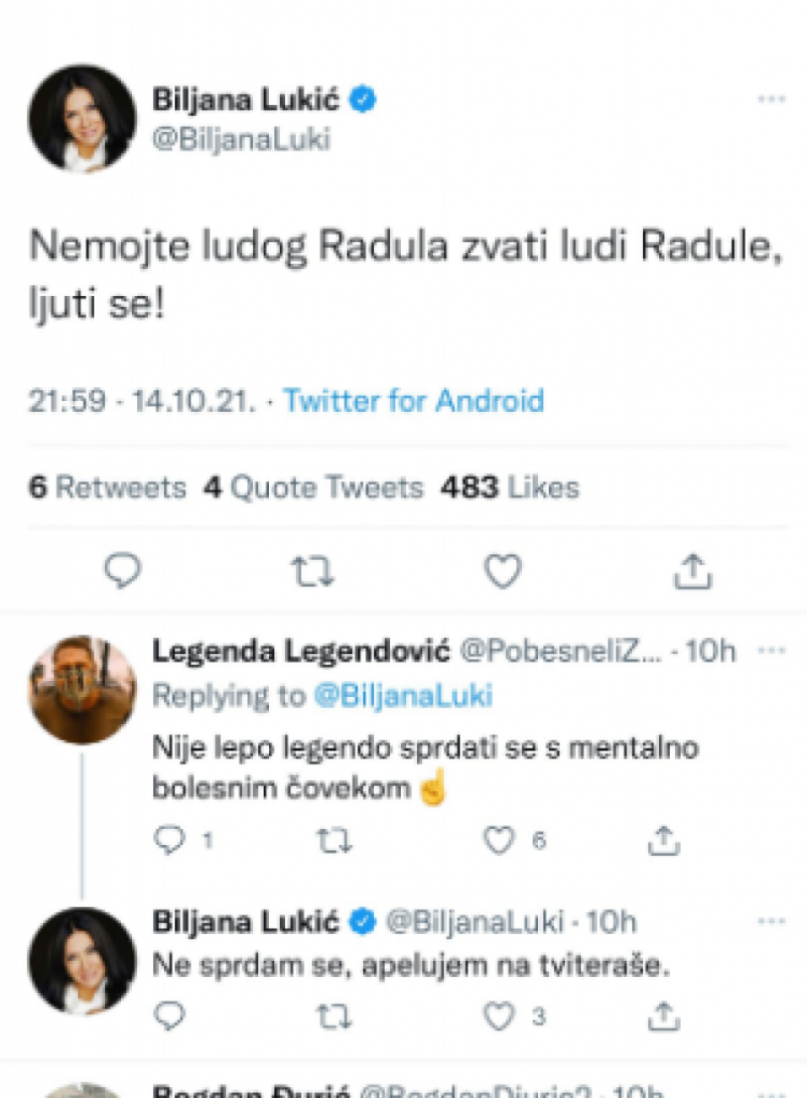 Lukićka je ponovo imala izlive besa, a svoje nekontrolisano ponašanje puno uvreda i ružnih reči pretvorila je u objavu na Tviteru uvredivši lidera pokreta Dosta je bilo Sašu Radulovića.