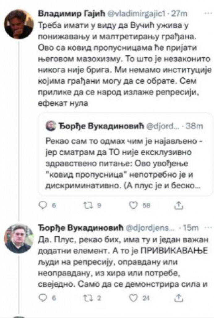 Veliki “dušebrižnici” iz Jeremiceve i Đilasove opozicije mesecima kukaju da se uvede pozitivna diskriminacija za one koji su vakcinisani. Danas je Krizni štab uveo samo minimalnu meru za restorane i klubove i odmah su se javili Vladimir Gajić i Đoka Vlah da napadaju državu i da kukaju kako je to teror!