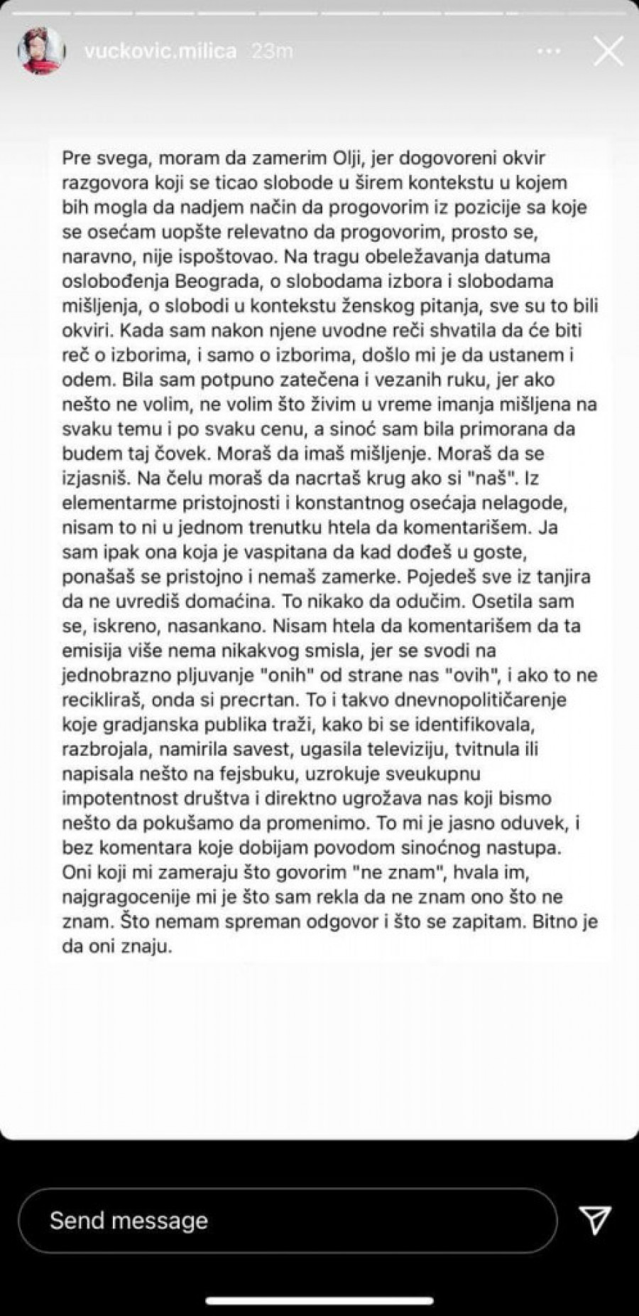 - Pre svega, moram da zamerim Olji, jer dogovoreni okvir razgovora koji se ticao slobode u širem kontekstu u kojem bih mogla da nađem način da progovorim iz pozicije sa koje se osećam uopšte relevantno da progovorim, prosto se naravno, nije ispoštovao - navela je u svojoj objavi na društvenim mrežama Vučkovićeva.