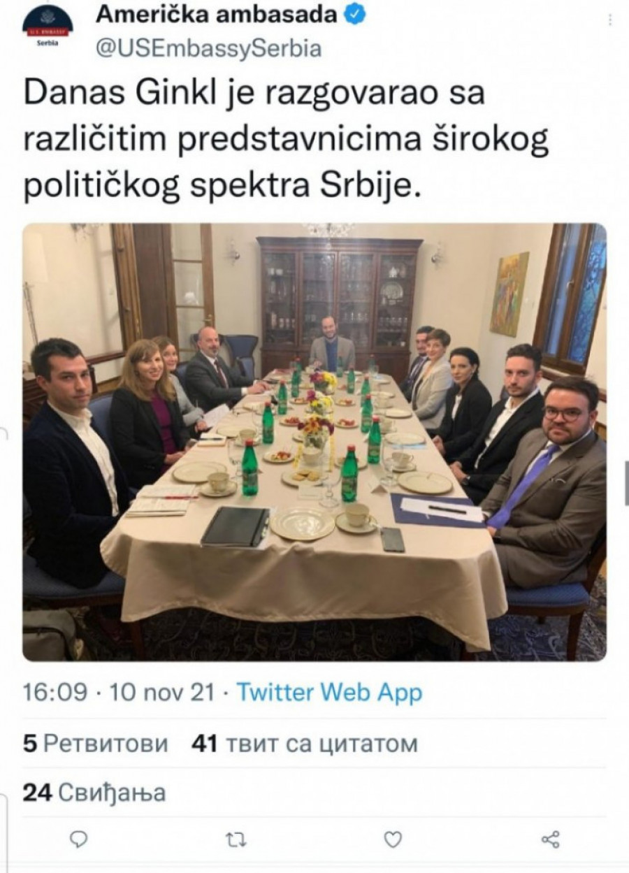 - Danas Ginkl razgovarao sa različitim predstavnicima širokog spektra Srbije - piše na Tviter nalogu ambasade SAD, uz objavljenu fotografiju.