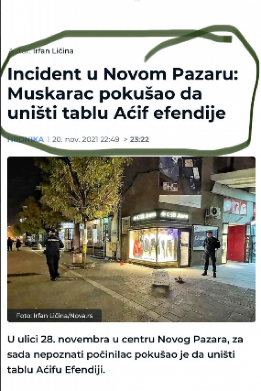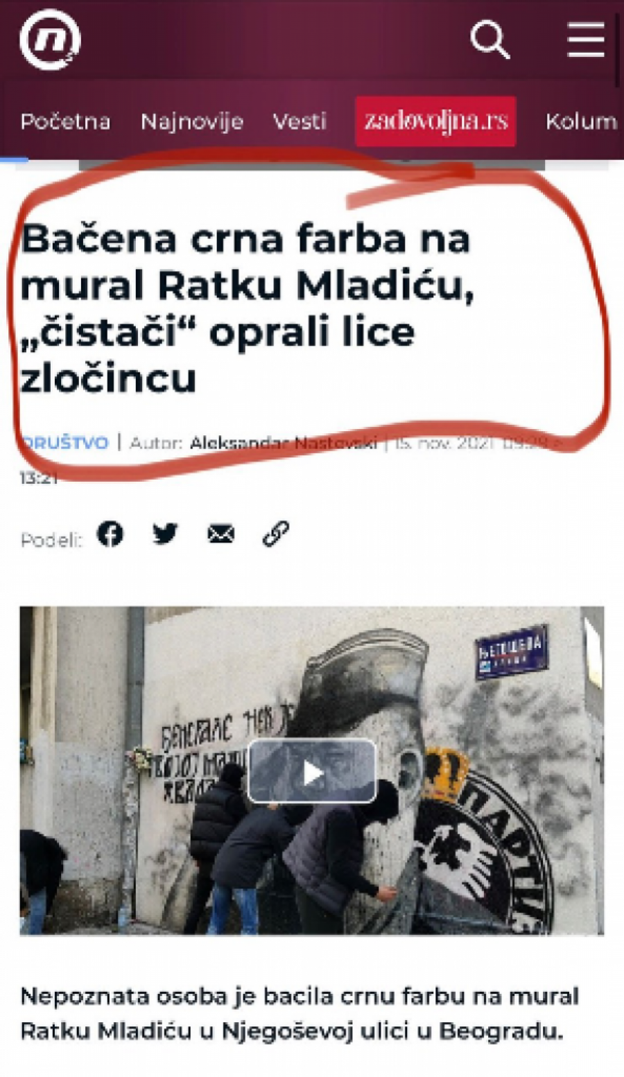 Naime, na portalu objavljeni su tekstovi sa naslovima “Incident u Novom Pazaru: Muškarac pokušao da uništi tablu Aćif efendije” i “Bačena crna farba na mural Ratku Mladiću, “čistači” oprali lice zločincu”.