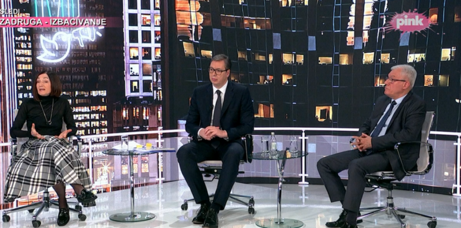 Predsednik Srbije Aleksandar Vučić gostuje u emisiji Hit tvit na televiziji Pink. Osim predsednika, u studiju TV Pink večeras su i novinarka Ljiljana Smajlović, kao i Rade Veljanovski iz GDF.