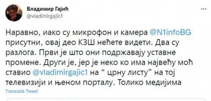 - Naravno, iako su mikrofon i kamera @N1infoBG prisutni, ovaj deo KZŠ nećete videti. Dva su razloga. Prvi je što oni podržavaju ustavne promene. Drugi je, jer je neko ko ima najveću moć stavio @vladimirgajic1 na “ crnu listu” na toj televiziji i njenom portalu. Toliko medijima.
