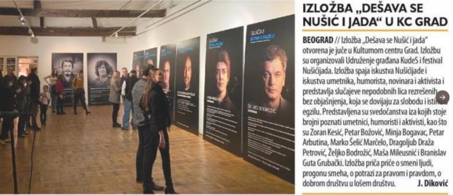 Draža Petrović i Željko Bodrožić na izložbi "Dešava se Nušić i jada”, koja je otvorena u Kulturnom centru Grad, bez problema su predstavljeni kao ljudi koji progoni režim Aleksandra Vučića i koji se iz "egzila", kako je navedeno, kao nepodobnih lica dovijaju za slobodu i istinu.