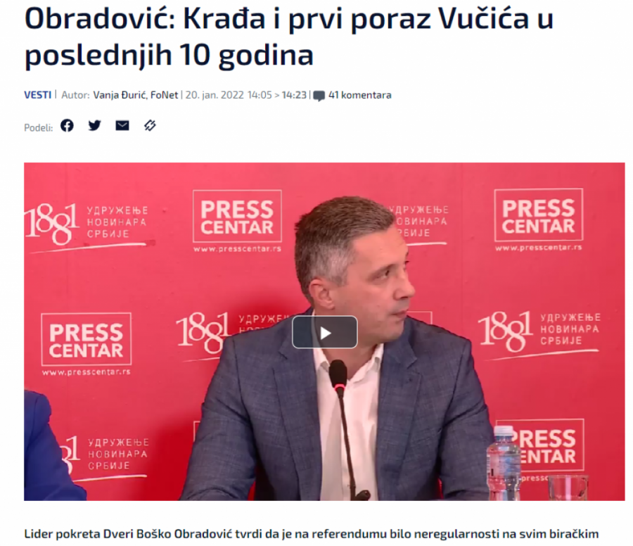Vest u kojoj lider Dveri Boško Obradović optužuje predsednika Srbije Aleksandra Vučića da je pokrao referendum i lažirao rezultate objavljena je u širokom formatu na portalu N1. Obradović u nekoliko pasusa navodi primere nekoliko nelogičnosti na glasanju za referendum u više gradova u Srbiji.
