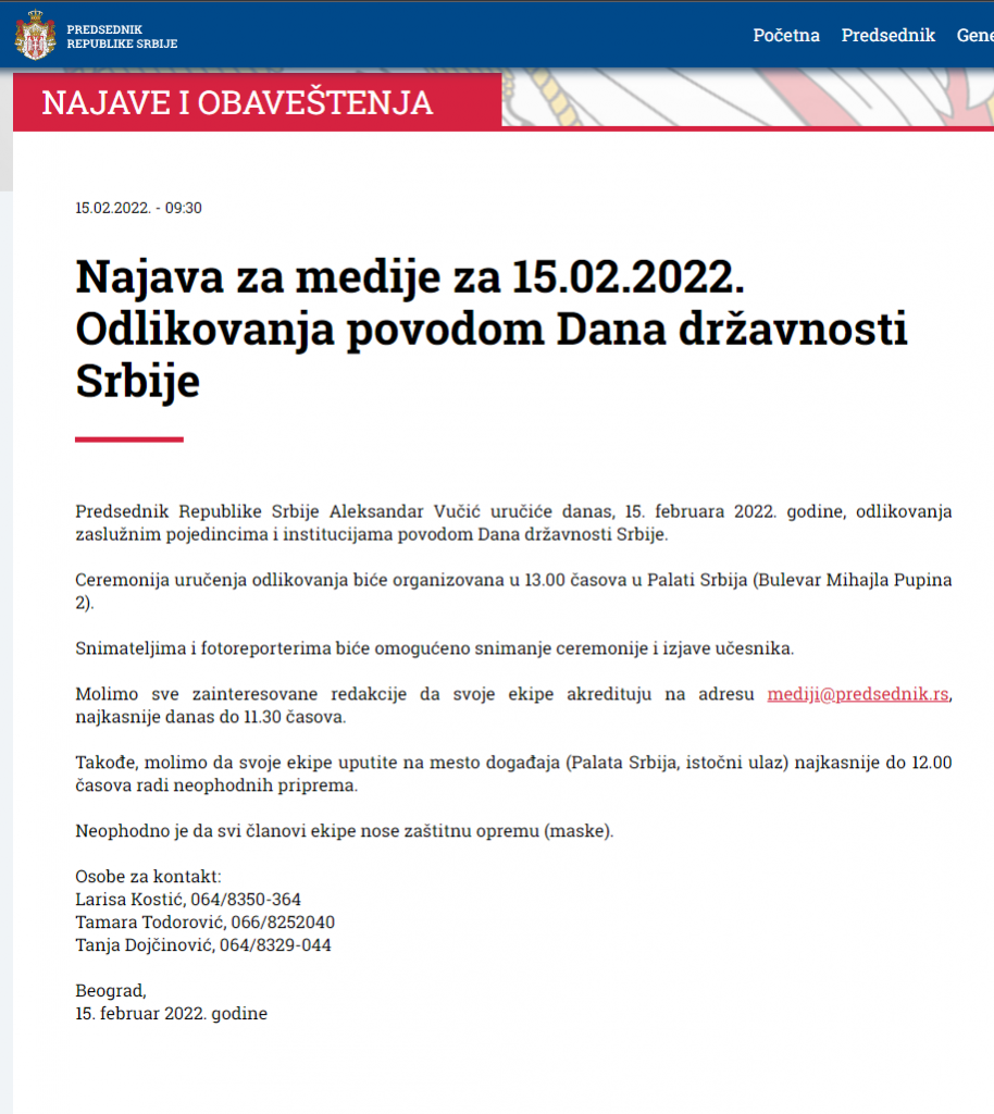 Koliko se izblamirala, najbolje govori podatak da je kompletna informacija o dodeli ordenja bila dostupna na sajtu Predsedništva Srbije, sa tačnim vremenom i mestom održavanja ceremonije.