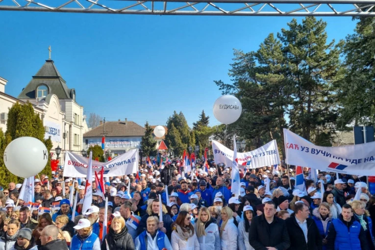 Građani nose srpske trobojke i zastave Srpske napredne stranke.