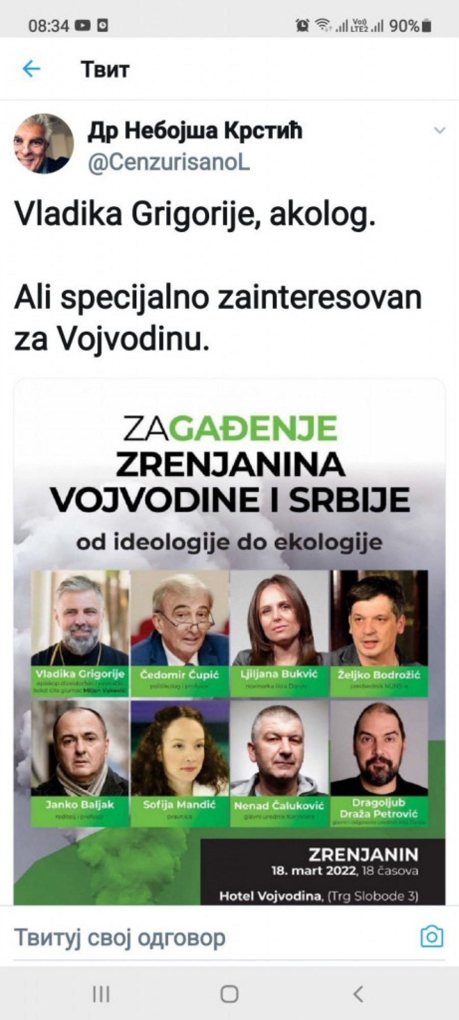 I možda bi na sekund i moglo da se pomisli da se vladika sad zainteresovao za ekologiju dok čovek ne vidi spisak ostalih učesnika tribine. Tu su Čedomir Čupić, politikolog i profesor, koji je u Ponoševom timu zadužen za pitanje korupcije, kao i Sofija Mandić, pravnica, koja je rekla da će Ponošu pomagati u kampanji u oblasti prava. Učesnici tribine su i Ljiljana Bukvić, novinarka lista Danas, Željko Bodrožić, predsednik NUNS, Janko Baljak, reditelj i profesor, Nenad Čaluković, glavni urednik Karaktera, i Dragoljub Draža Petrović, glavni i odgovorni urednik Danasa.