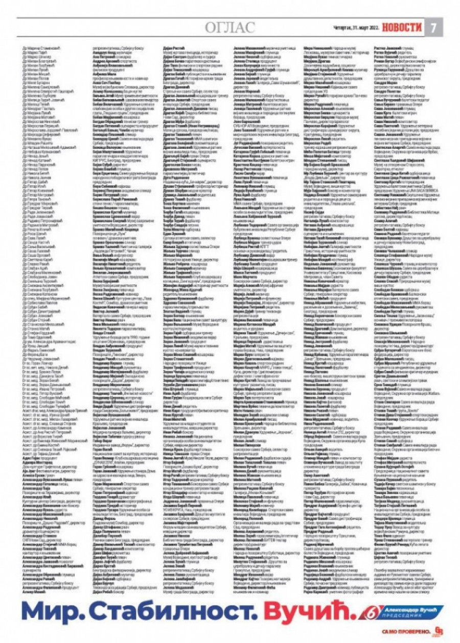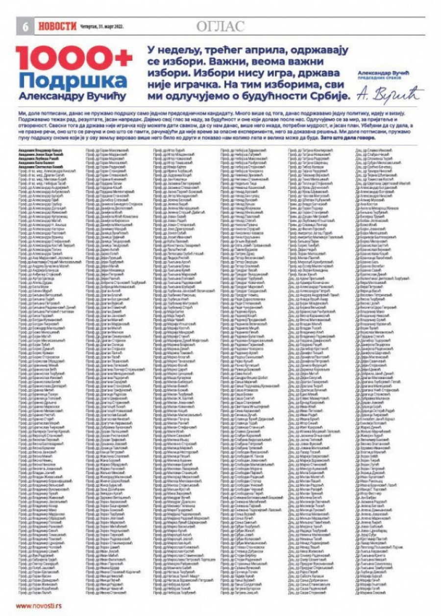 - Mi ne pružamo podršku samo jednom predsedničkom kandidatu. Mnogo više od toga, danas podržavamo jednu politiku, ideju i viziju. Podržavamo težak rad, rezultate, jasan napredak. Dajemo svoj glas za nadu, za budućnost i one koji dolaze posle nas. Odlučujemo se za mir, za prijatelje i otvorenost. Svesni toga da država nije igračka koju možete dati svakom, da su nam danas, više nego ikad, potrebni mudrost i jasan stav. Ubeđeni da su dela, a ne prazne reči, ono što se računa i ono što se pamti, računajući da nije vreme za opasne eksperimente, nego za dokazana rešenja. Mi pružamo punu podršku onome koji je u ovu zemlju verovao više nego bilo ko drugi i pokazao nam koliko lepa i velika može da bude. Zato što dela govore - objavljeno je u ime 1000 javnih ličnosti koji su podržali predsedničkog kandidata Aleksandra Vučića.