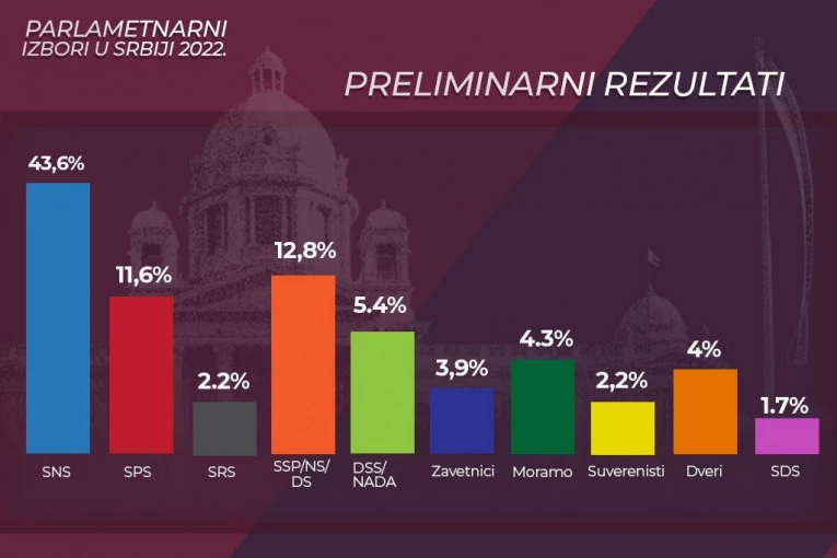 Prema prvim preliminarnim rezultatima parlamentarnih izbora, najveću podršku osvojila je SNS sa 122 mandata.