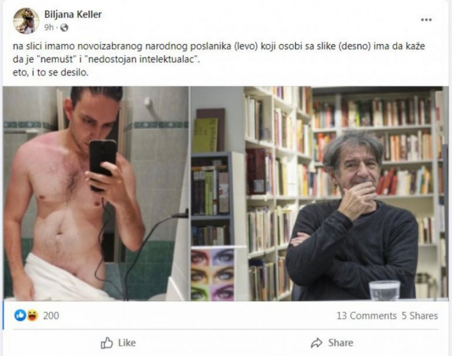 - Na slici imamo novoizabranog narodnog poslanika (levo) koji osobi sa slike (desno) ima da kaže da je "nemušt" i "nedostojan intelektualac". Eto, i to se desilo - napisala je spisateljica.