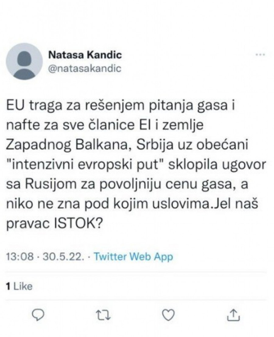 - EU traga za rešenjem pitanja gasa i nafte za sve članice EU i zemlje Zapadnog Balkana, Srbija uz obećani “intenzivni evropski put” sklopila ugovor sa Rusijom za povoljniju cenu gasa, a niko ne zna pod kojim uslovima. Je l’ naš pravac Istok? - napisala je Kandićeva na Tviteru.