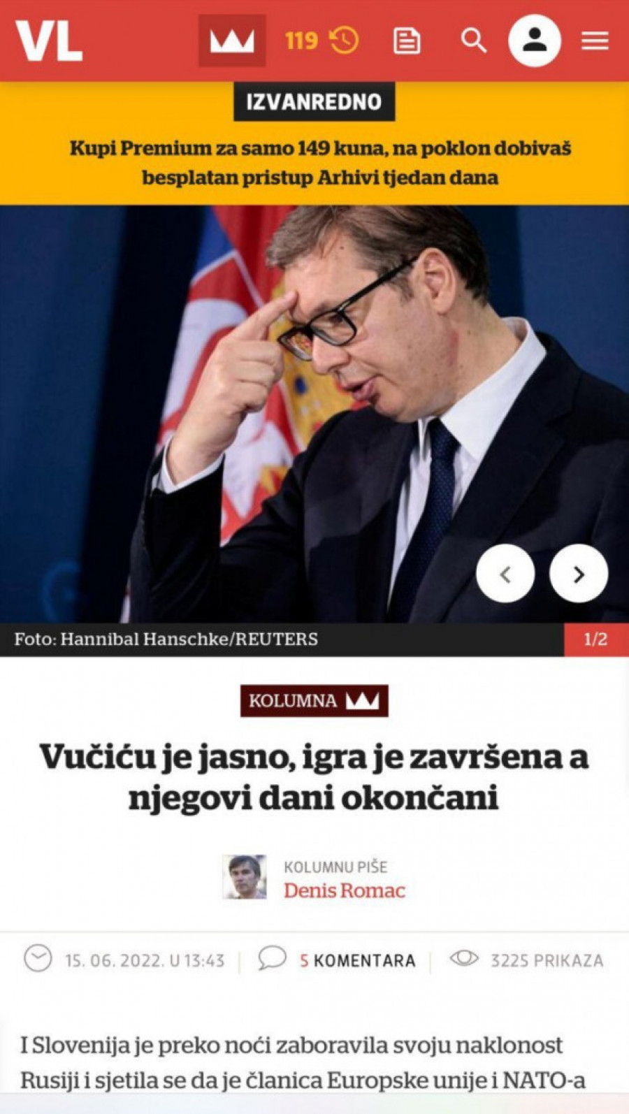 Naime, u Večernjem listu osvanula je vest sa naslovom “Vučiću je jasno, igra je završena, a njegovi dani okončani”. Vest i njen naslov imaju svojevrsan preteći ton, koji eskalira u zaključnoj rečenici teksta.