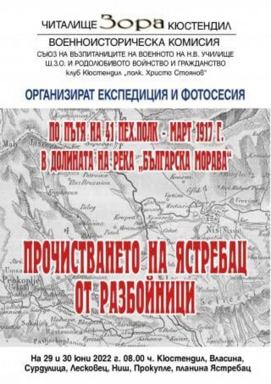 “Stazom 41. pešadijskog puka - mart 1917. godine - čišćenje Jastrepca od razbojnika” naziv je ekspedicije koju bugarska nevladina organizacija “Vojno-istorijski komitet” organizuje 29. i 30. juna na jugu Srbije.