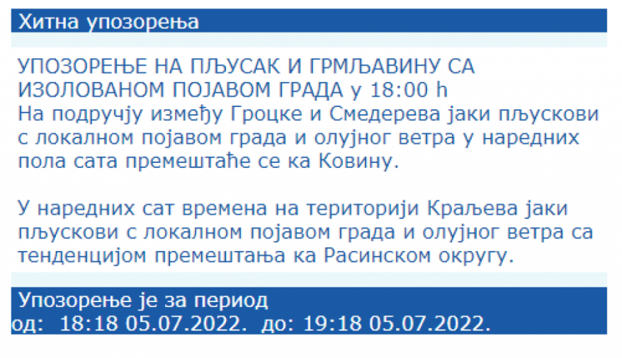 Republički hidrometeorološki zavod izdao je hitno upozorenje za jake pljuskove na području Grocke i Smedereva.