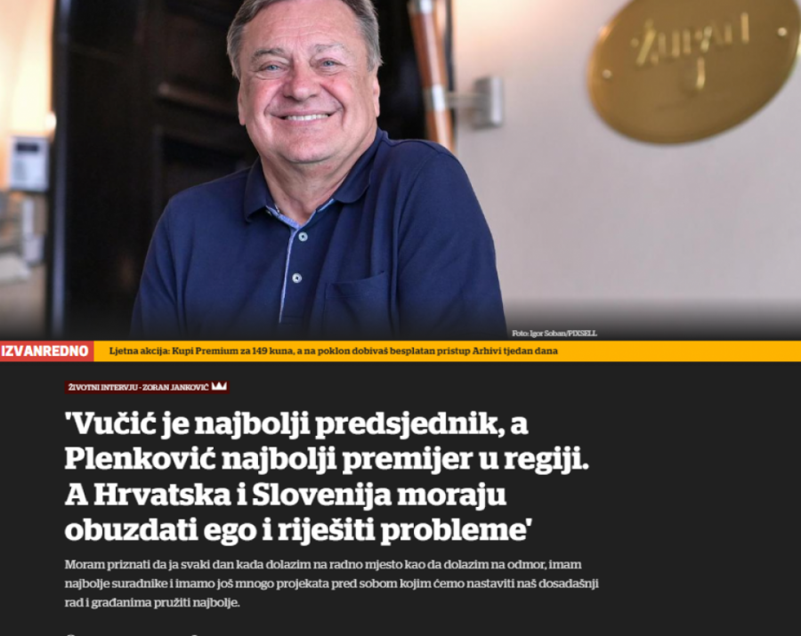 - Šta god neko mislio o predsedniku Srbije Aleksandru Vučiću, on je za mene najbolji predsednik na prostoru bivše Jugoslavije. S druge strane najbolji premijer je hrvatski, Andrej Plenković. Priznajem to, iako su Vučić i Plenković desni, a ja levi - otkrio je Janković u intervjuu.