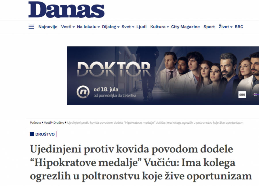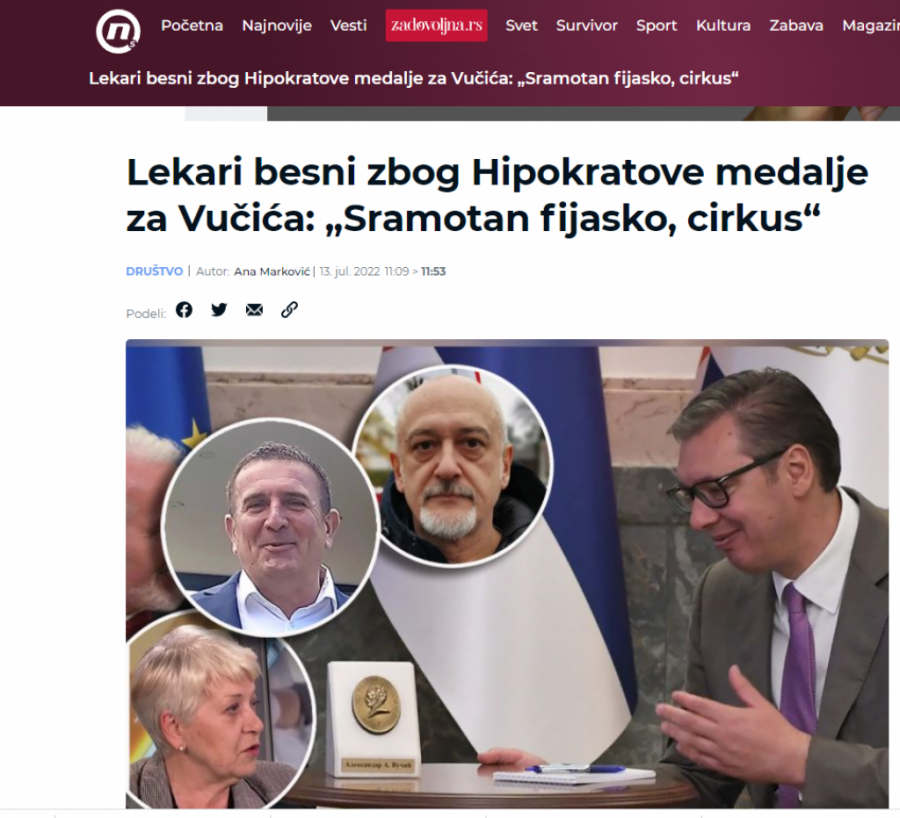 Tako su, brže bolje, počeli da se ređaju naslovi na portalu Danas, N1 i Nova S, u kojima se navodi da su lekari besni zbog toga što je "Hipokratova medalja" završila kod Vučića.