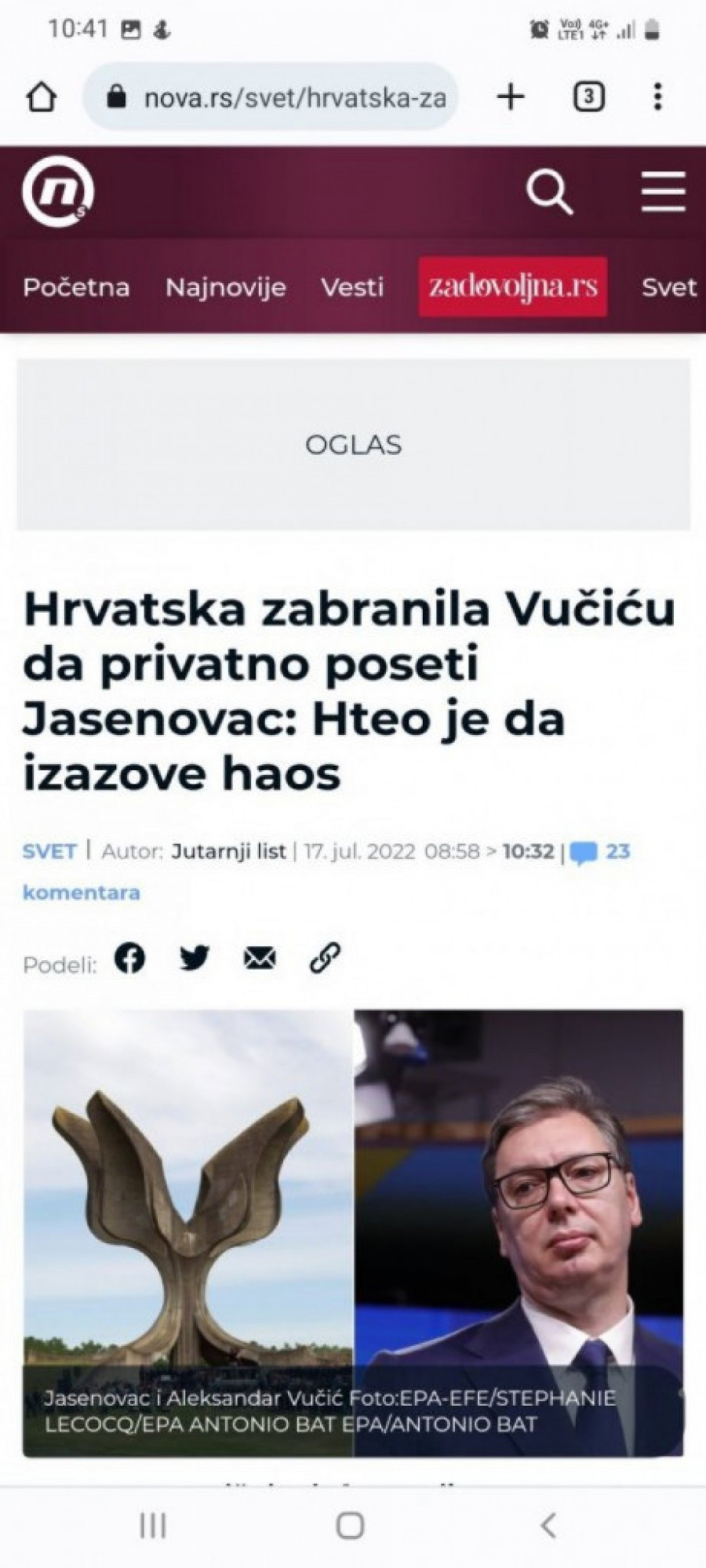 "Nova S" je vest o skandaloznoj odluci Hrvatske objavila pod naslovom "Hrvatska zabranila Vučiću da privatno poseti Jasenovac: Hteo je da izazove haos".