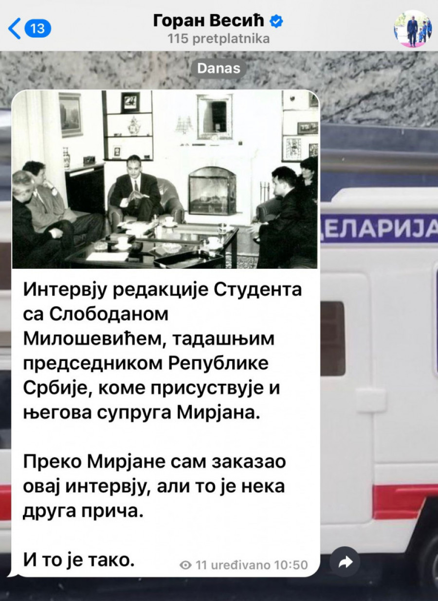 Vesić je te 1992. godine bio zamenik urednika lista "Student" kada je zakazao intervju najpre sa suprugom tadašnjeg predsednika Srbije Mirom Marković, a koju je zatim pitao da li bi mogao da intrevjuiše i njenog supruga.