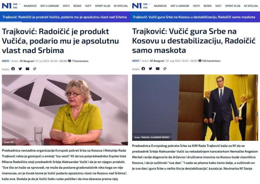 Predsednica nevladine organizacije Evropski pokret Srba sa Kosova i Metohije Rada Trajković u roku od samo mesec i po dana daje oprečne izjave za tajkunske medije.
