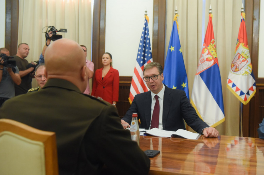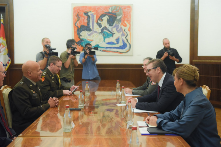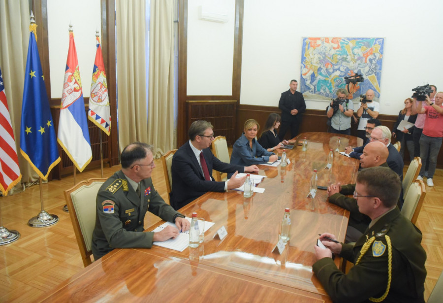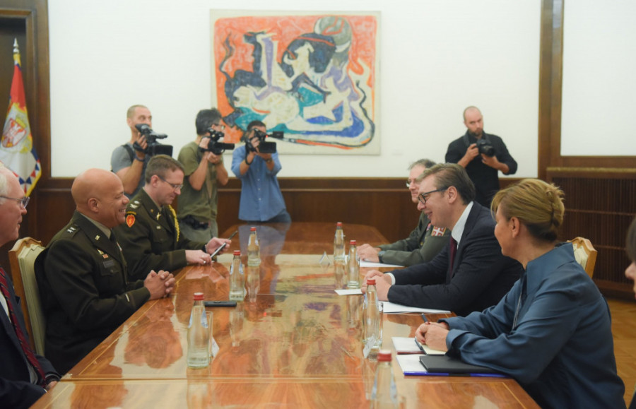 Predsednik Republike Srbije Aleksandar Vučić sastao se sa komandantom Nacionalne garde Ohaja general-majorom Džonom Harisom u zgradi Generalnog sekretarijata predsednika Republike na Andrićevom vencu.