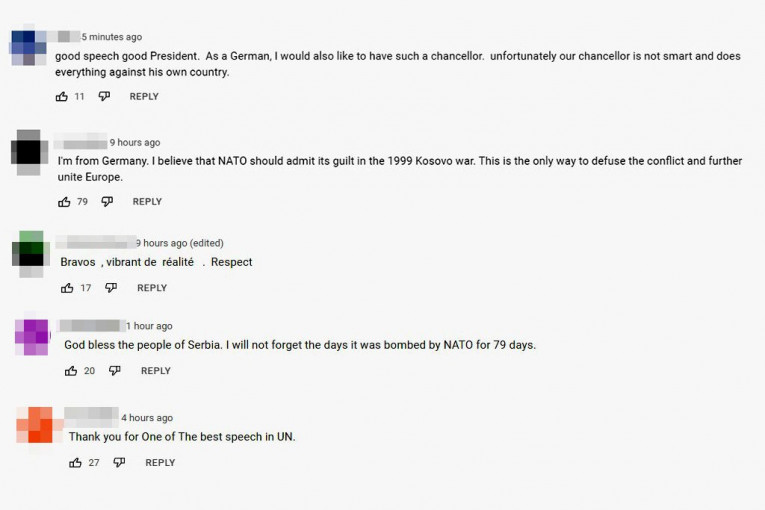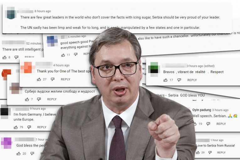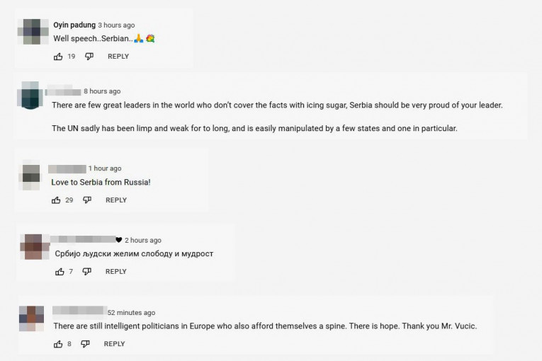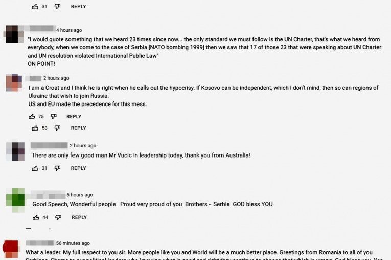- Kakav lider. Puno poštovanje, gospodine. Da je više ljudi kao što ste vi, svet bi bio bolje mesto. Pozdrav iz Rumunije svim Srbima. Sramota za naše političare koji znaju šta je dobro a šta loše, i nastavlju da rade loše. Bog vas blagoslovio. I da, "Živela Srbija" - napisao je jedan korisnik na "Jutjubu" aludirajući na Vučićev trijumfalni poklič kojim je završio govor na Ist Riveru.