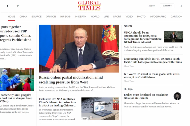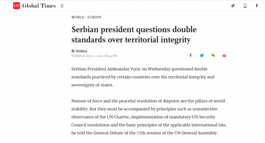 Kineski medij Global Times pisali su o oštrom govoru lidera Srbije Aleksandra Vučića na Generalnoj debati 77. zasedanja Generalne skupštine UN, navodeći kako je predsednik doveo u pitanje dvostruke standarde međunarodne zajednice u pogledu teritorijalnog integriteta i suvereniteta država.