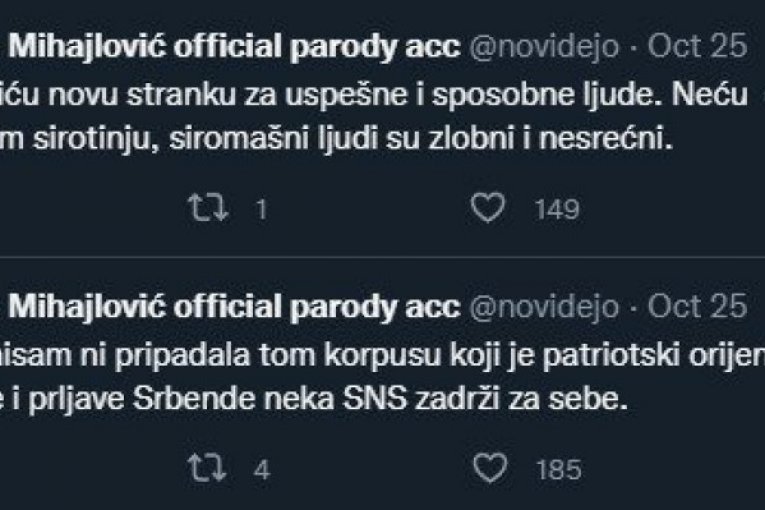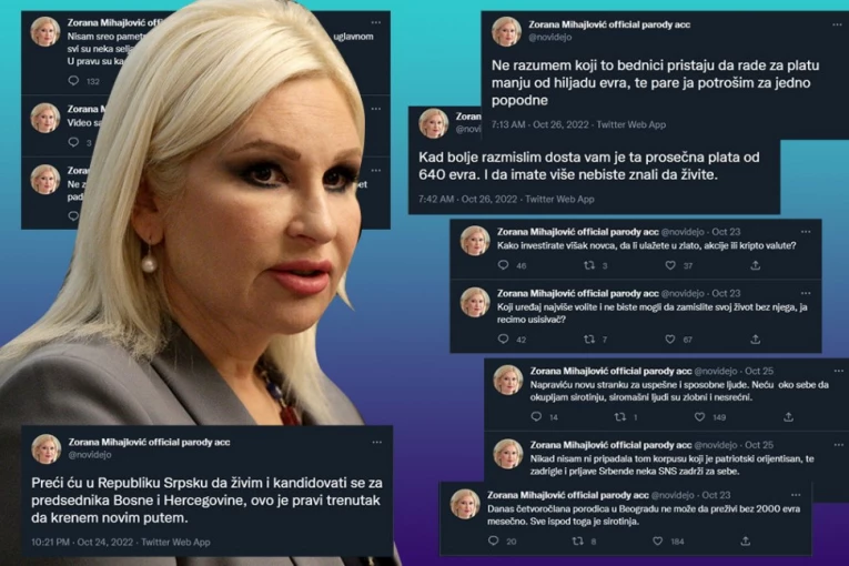 - Napraviću novu stranku za uspešne i sposobne ljude. Neću oko sebe da skupljam sirotinju, siromašni ljudi su zlobni i nesrećni - navodi se u jednoj od objava lažnog Tviter profila Zorane Mihajlović.