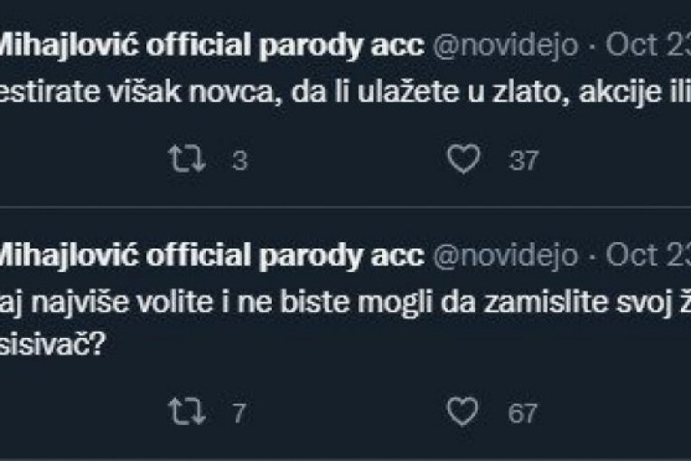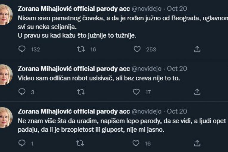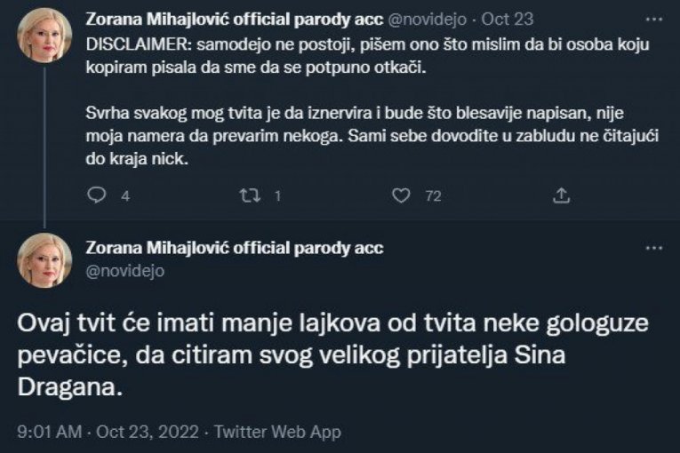 - Pišem ono što mislim da bi osoba koju kopiram pisala da sme da se potpuno otkači. Svrha mog tvita je da iznervira i bude što blesavije napisan, nije moja namera da prevarim nekoga. Sami sebe dovodite u zabludu ne čitajući do kraja nick (nadimak) - navodi osoba koja se nalazi iza lažnog profila Zorane Mihajlović upisanog kao Zorana Mihajlović official parody acc.