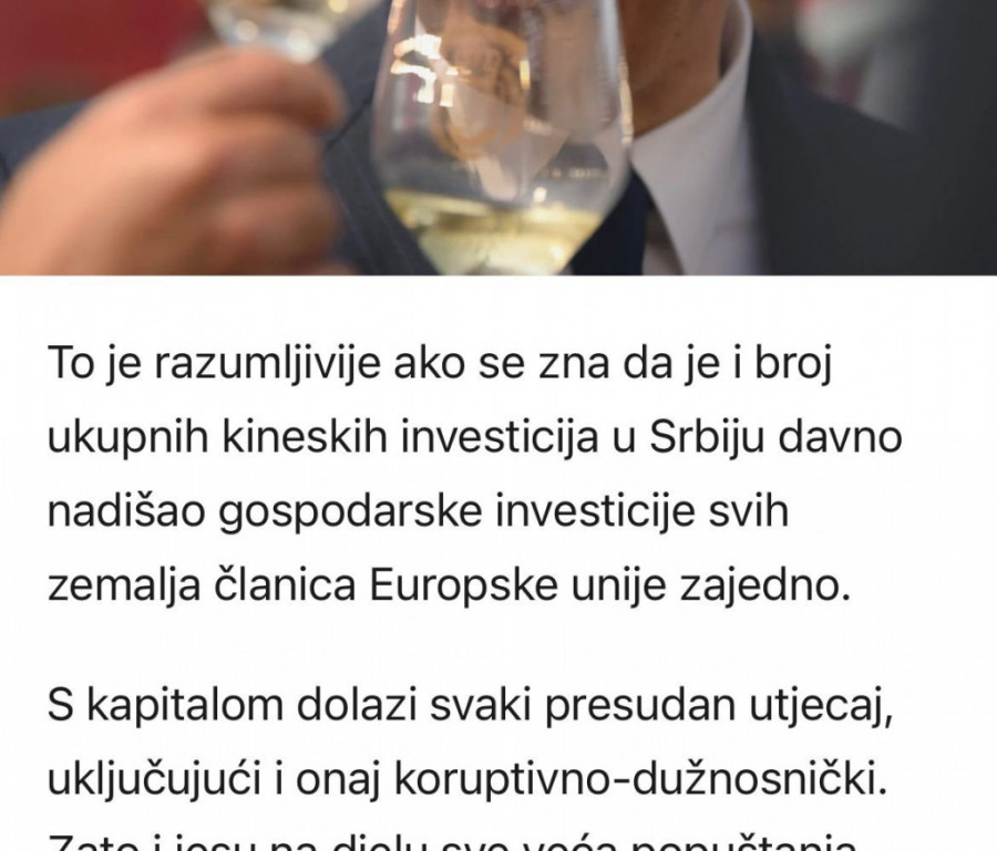 U bolesnom tekstu dalje se navodi ''kako je to razumljivije ako se zna da je i broj ukupnih kineskih investicija u Srbiji davno nadišao gospodarske investicije svih zemalja članica Evropske unije zajedno'' , a ono što najviše upada u oči je bezdokazna optužba u kojoj se ističe kako '''s kapitalom dolazi svaki presudan utjecaj, uključujući i onaj koruptivno-dužnosnički. Zato i jesu na djelu sve veća popuštanja srbijanskih političara prema kineskim zahtjevima nepriličnim demokracijama''.