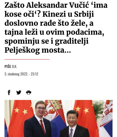 Hrvatski mediji ponovo su napadali gnusnim naslovima, u kojima blate srpskog predsednika, iznoseći otrovne rečenice, poput one ''Zašto Aleksandar Vučić ima ''kose oči'', dok navode kako ''Kinezi u Srbiji doslovno rade što žele, a tajna leži u ovim podacima, spominju se i graditelji Pelješkog mosta...''.
