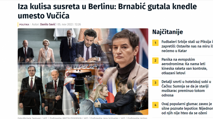 Ništa manje skandalozan nije ni tekst koji su objavili na svom portalu u kome teške sastanke u Berlinu na kojima je bila premijerka Brnabić nazivaju "vrućim zadatkom" koji joj je uvalio predsednik.