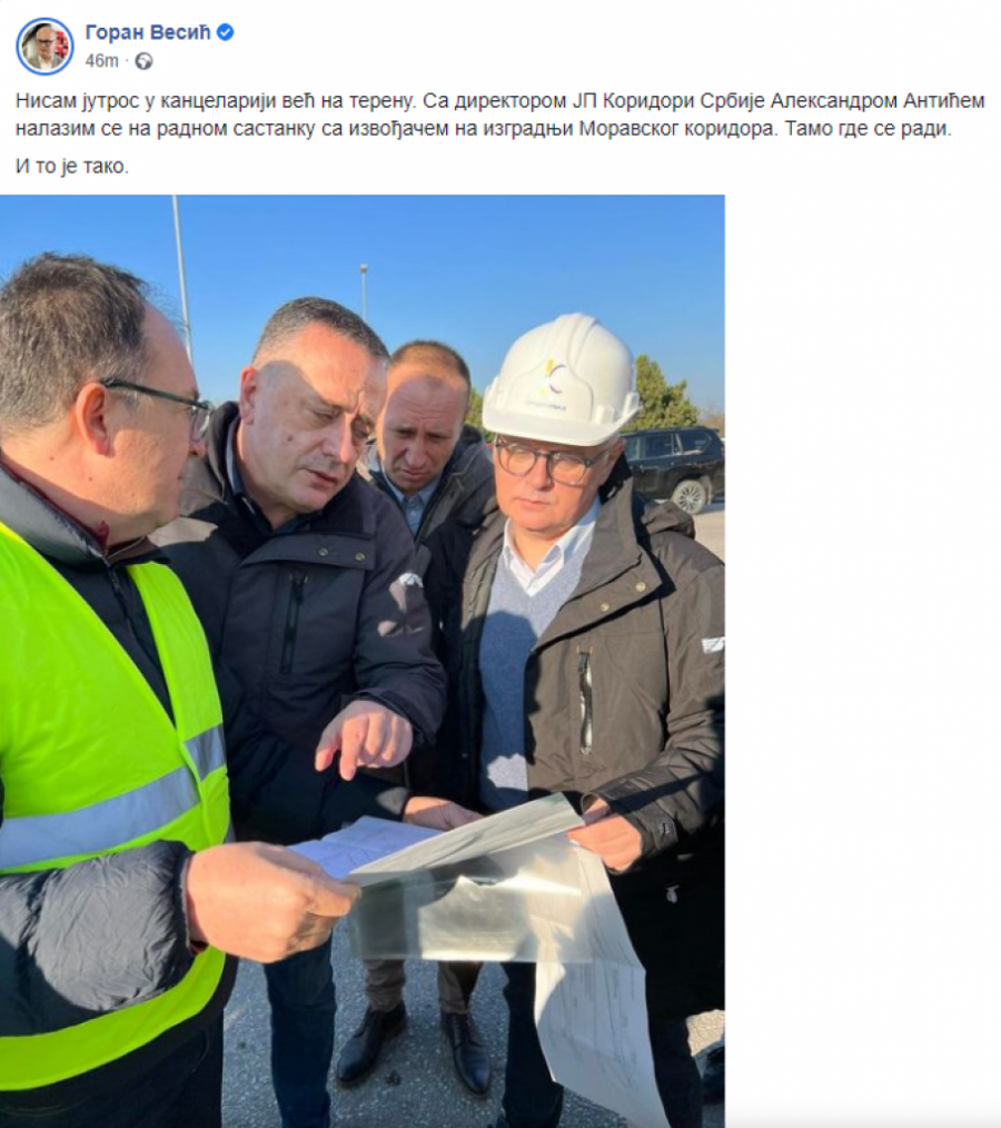"Nisam jutros u kancelariji već na terenu. Sa direktorom JP Koridori Srbije Aleksandarom Antićem nalazim se na radnom sastanku sa izvođačem na izgradnji Moravskog koridora. Tamo gde se radi. I to je tako", napisao je Vesić.