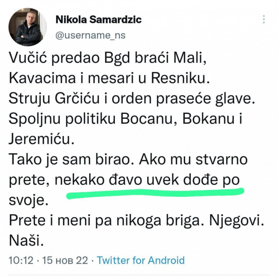 Prete i meni, pa nikoga briga. Njegovi. Naši - napisao je Samardžić.