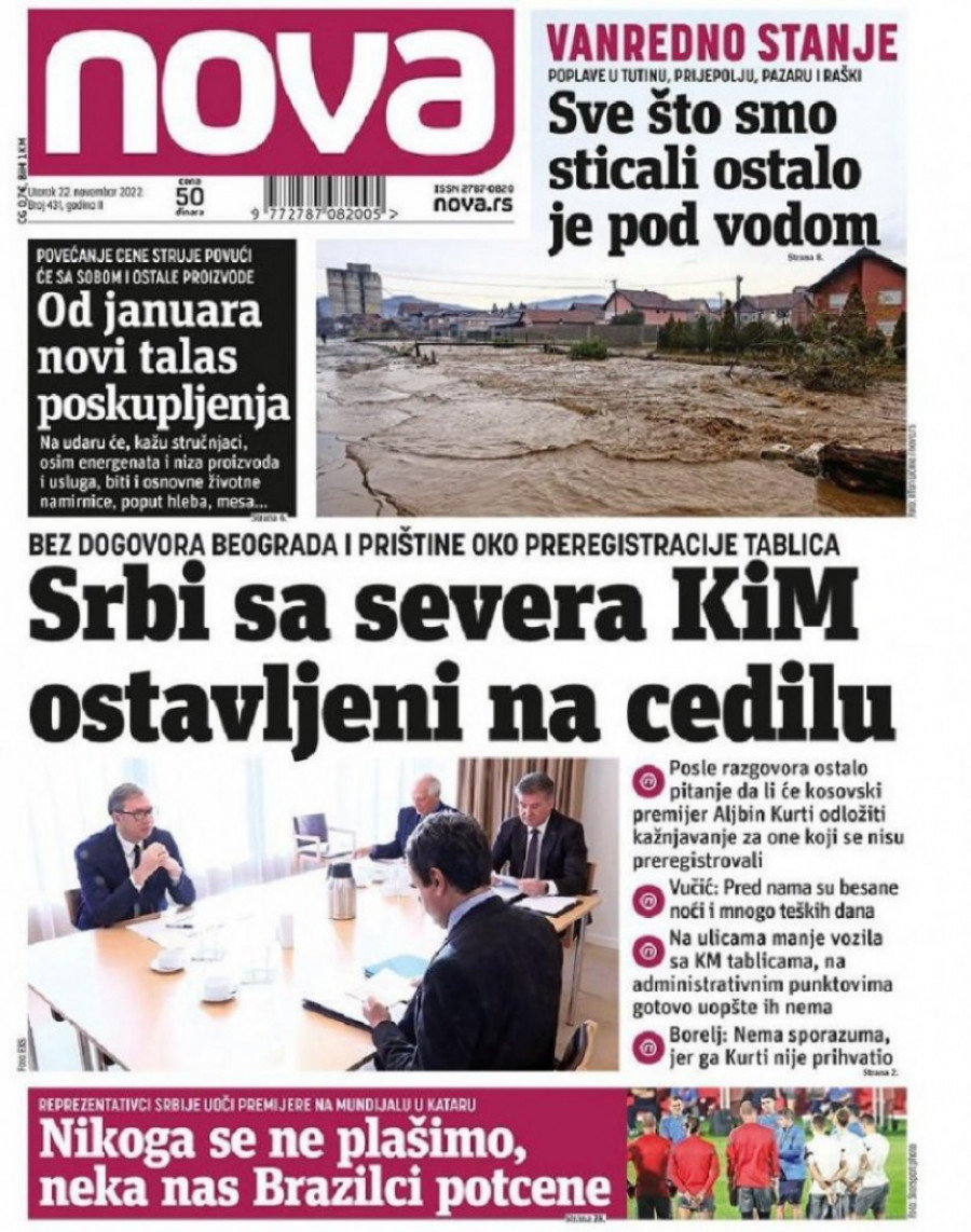 Oni su za sutrašnje izdanje na naslovnici stavili vest sa naslovom "Srbi sa severa KiM ostavljeni na cedilu".