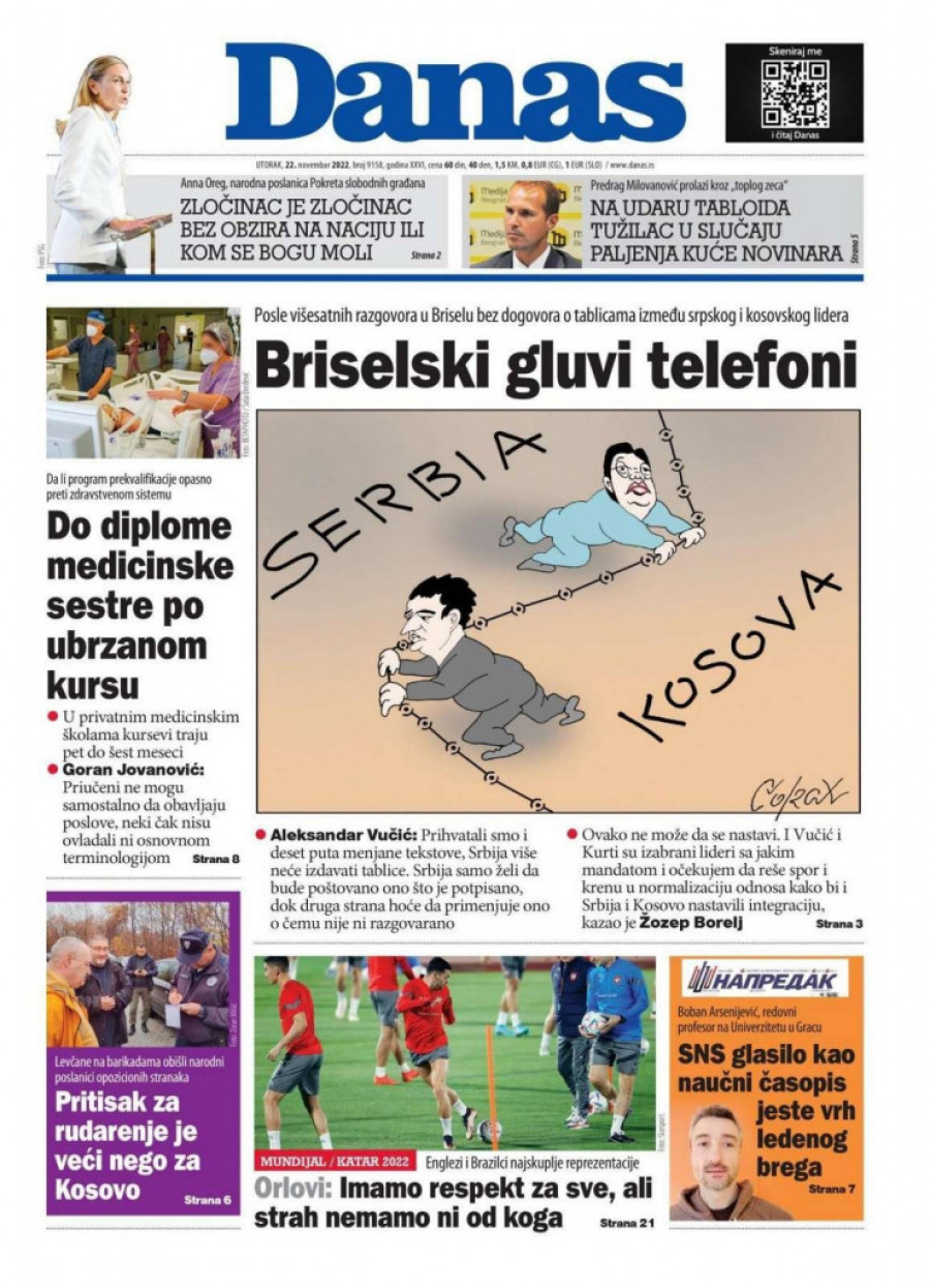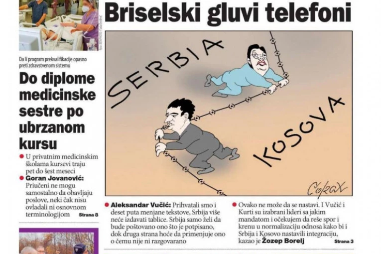 I kada je očito da je Aljbin Kurti taj koji ne prihvata dijalog, što je potvrdio čak i šef evropske diplomatije Žozep Borelj, dnevni list Danas se pravi "najpametniji" i objavljuje naslovnicu sa karikaturom na kojoj je predstavljeno da svako vuče na svoju stranu, a naslov krajnje posprdan - Briselski gluvi telefoni.