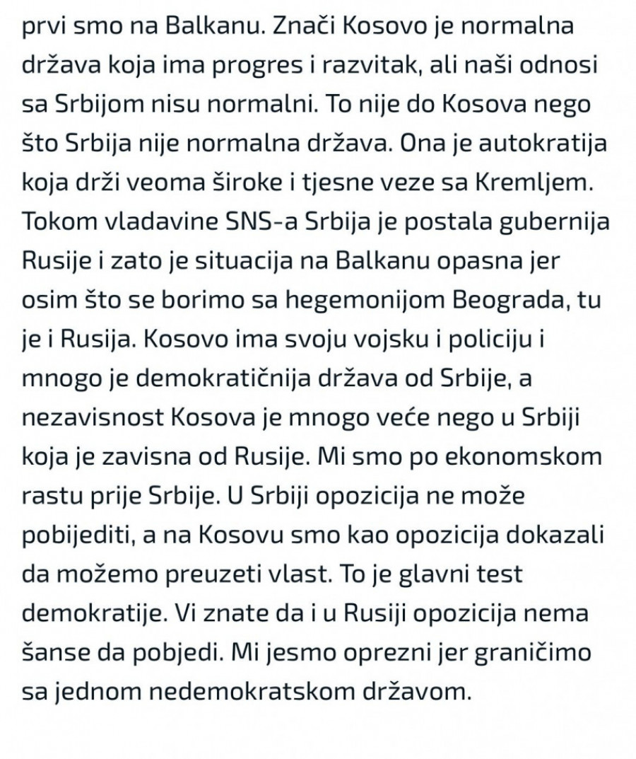 - Kosovo je normalna država koja ima progres i razvitak, ali naši odnosi sa Srbijom nisu normalni. To nije do Kosova nego što Srbija nije normalna država - samo je deo ovog skandaloznog i sramotnog intervjua.