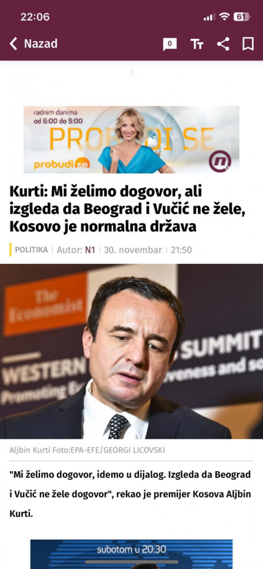 Kurti je takođe naveo kako navodno "Beograd i Vučić ne žele dogovor, a kako je on spreman za to", iako su se u nedavnom susretu u Briselu svi uverili da je politika koju vodi Aleksandar Vučić zapravo politika mira, a da je Aljbin Kurti taj koji želi da sukob.