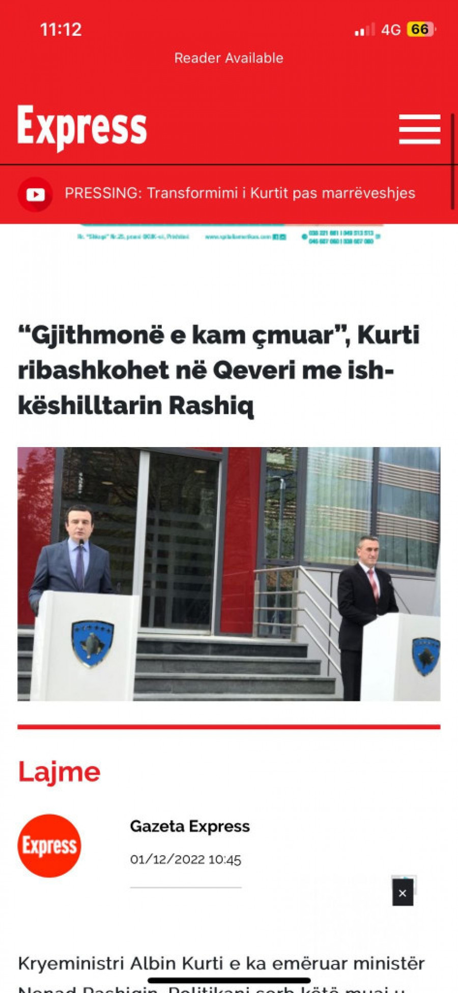 - Uvek sam ga cenio - Kurti ponovo ulazi u Vladu sa bivšim savetnikom Rašićem vest je broj jedan na albanskim portalima, uz fotografiju gde se "rame uz rame" nalaze premijer lažne države Kosovo i Nenad Rašić.