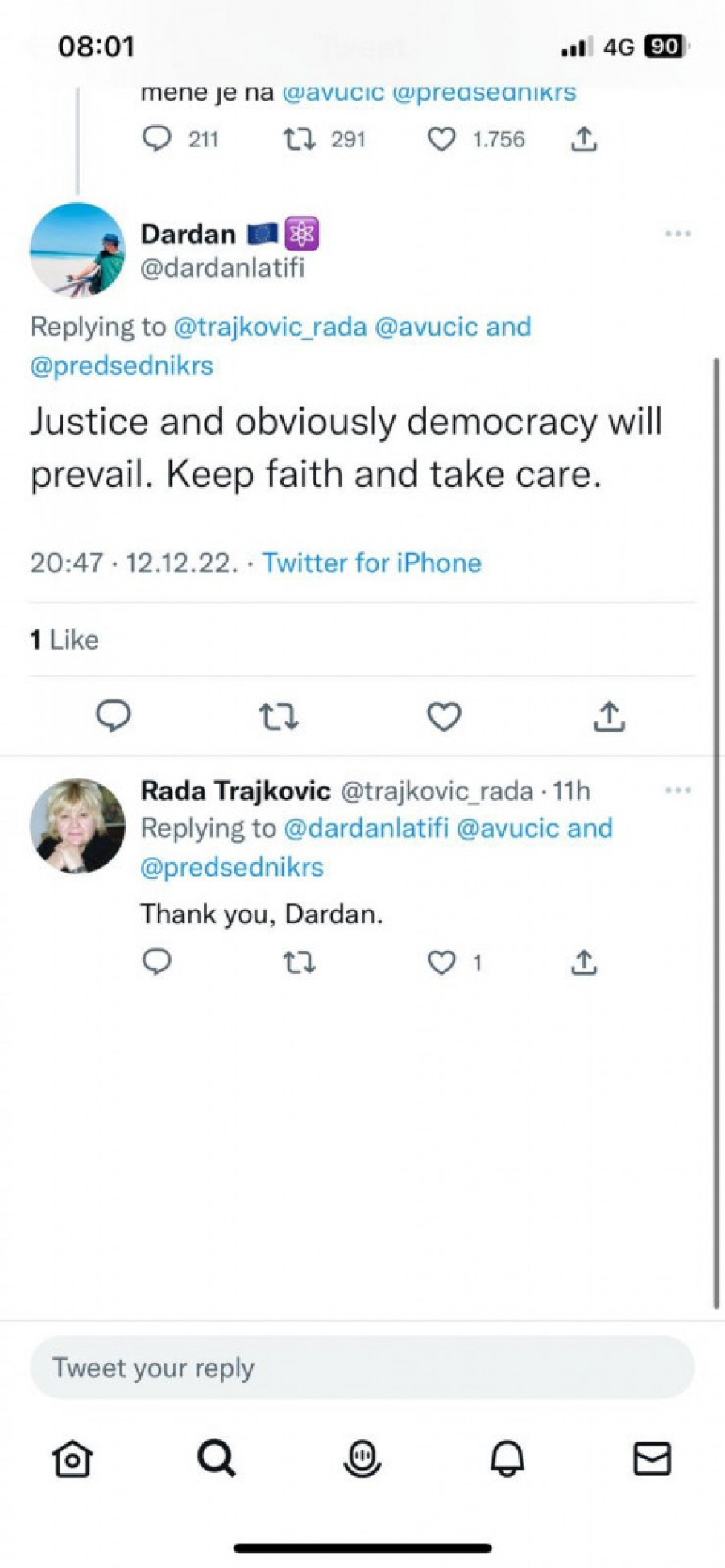 Da je Rada Trajkovic sve popularnija među Kurtijevcima koji na sve moguće načine gledaju kako da blate našu državu, pokazuju i tvitovi koje je razmenjivala sa Dardanom iz Belgije, koji u svakom tvitu pljuje našu drzavu.