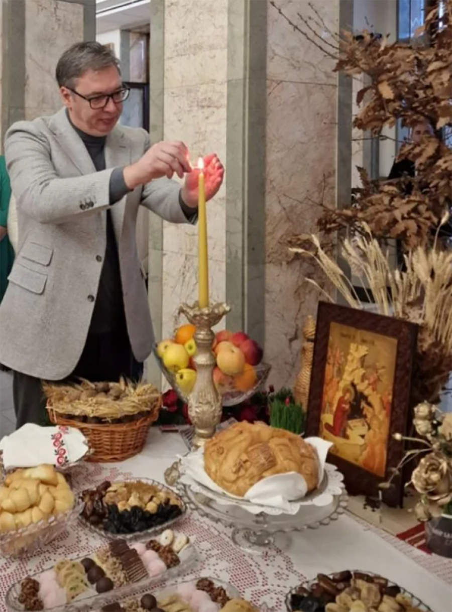 Vučić je zapalio sveću, dok se na objavljenim fotografijama vidi česnica, kao i raznovrsna hrana koja se prema srpskim običajima služi na Badnji dan.