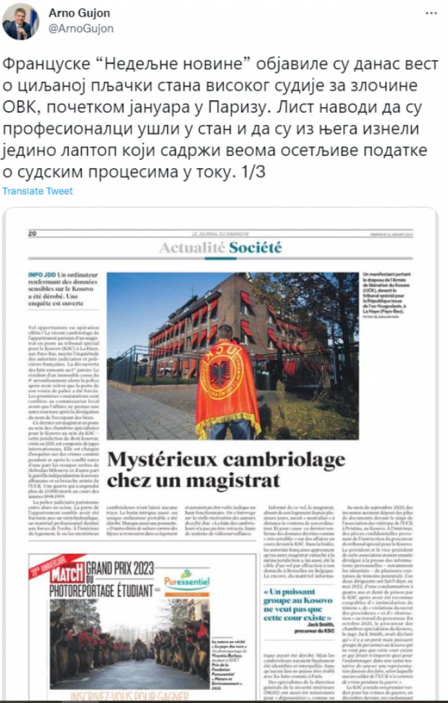 Francuske “Nedeljne novine” objavile su danas vest o ciljanoj pljački stana visokog sudije za zločine OVK, početkom januara u Parizu, preneo je na Tviteru humanitarac i direktor Uprave za saradnju s dijasporom i Srbima u regionu Arno Gujon.