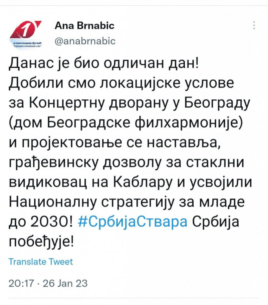 - Danas je bio odličan dan! Dobili smo lokacijske uslove za Koncertnu dvoranu u Beogradu (dom Beogradske filharmonije) i projektovanje se nastavlja, građevinsku dozvolu za stakleni vidikovac na Kablaru i usvojili Nacionalnu strategiju za mlade do 2030! #SrbijaStvara Srbija pobeđuje!